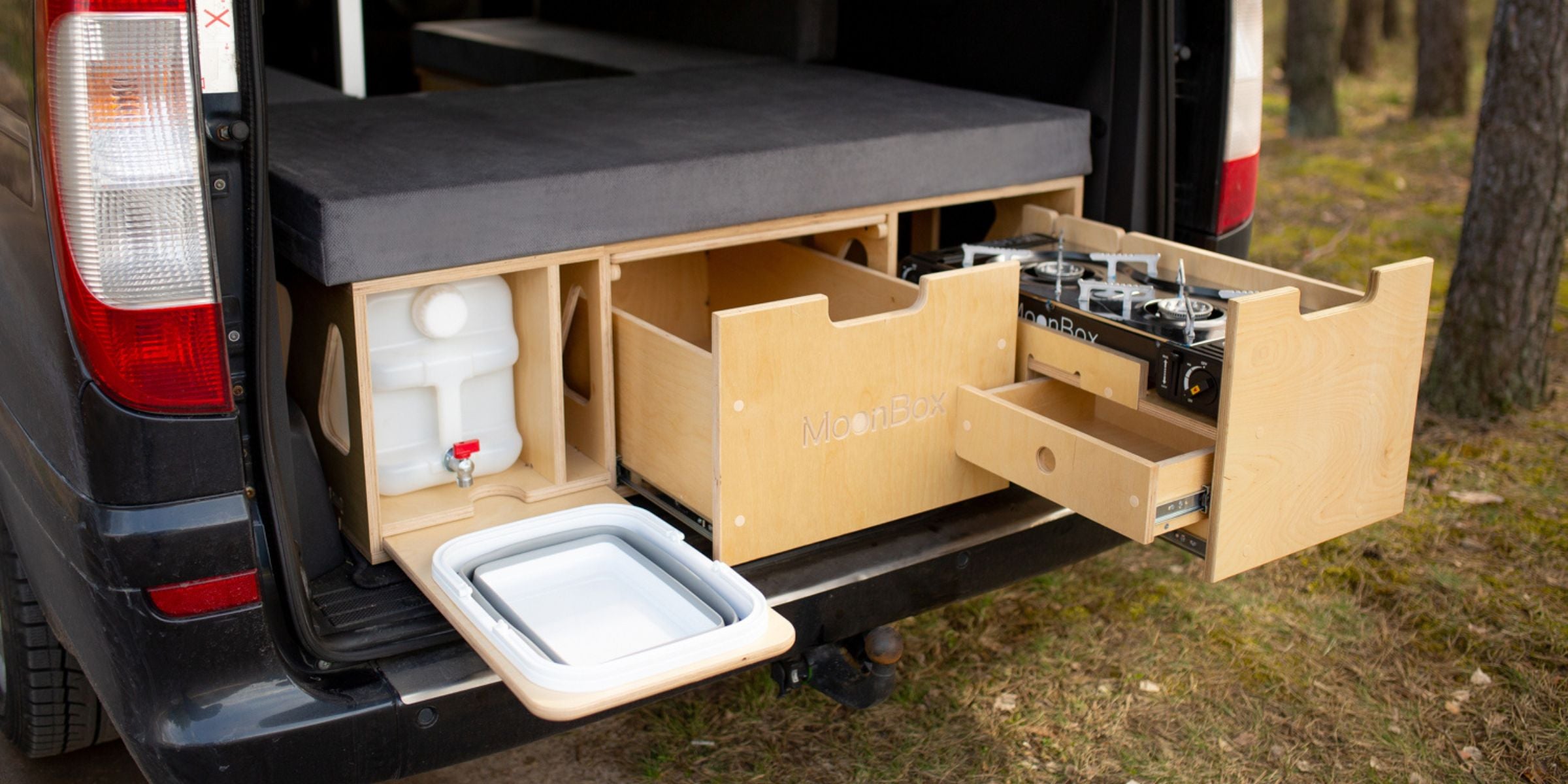 Die Campingküche enthält außerdem eine ausziehbare Schublade mit dem Moonbox Gasherd.
